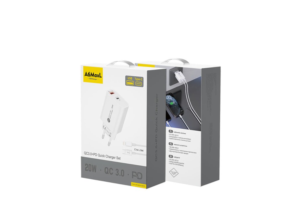 Univerzálna nabíjačka A6MaxL s výkonom 20W poskytuje rýchle, bezpečné a spoľahlivé nabíjanie smartfónov, tabletov aj iných zariadení. Vďaka technológiám Power Delivery (PD) a Quick Charge 3.0 sa tvoj telefón nabije až 3× rýchlejšie než s bežnou nabíjačkou. Súčasťou balenia je USB-C ⇄ Lightning kábel (1m) – ideálny pre zariadenia Apple.