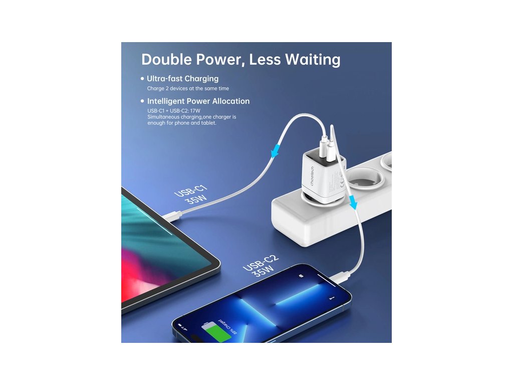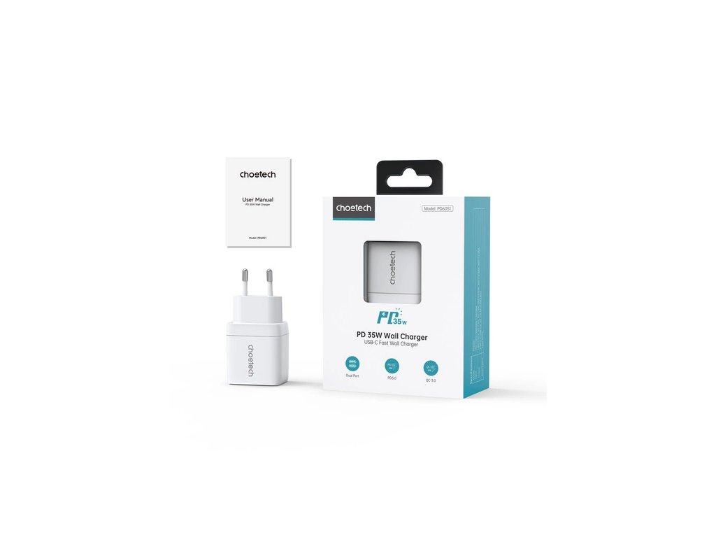 Choetech PD6051 je moderná sieťová nabíjačka vybavená dvomi USB-C výstupmi a technológiou GaN (Gallium Nitride), ktorá zaisťuje efektívne a rýchle nabíjanie s výkonom až 35 W. Je ideálna na každodenné použitie pre smartfóny, tablety, slúchadlá či menšie notebooky.