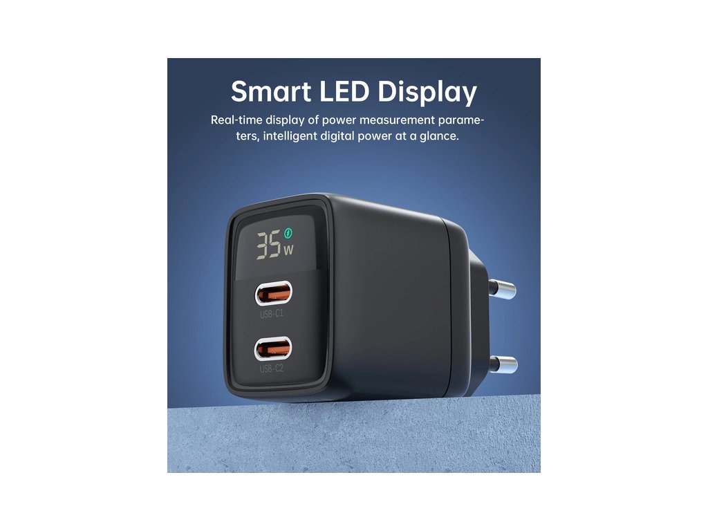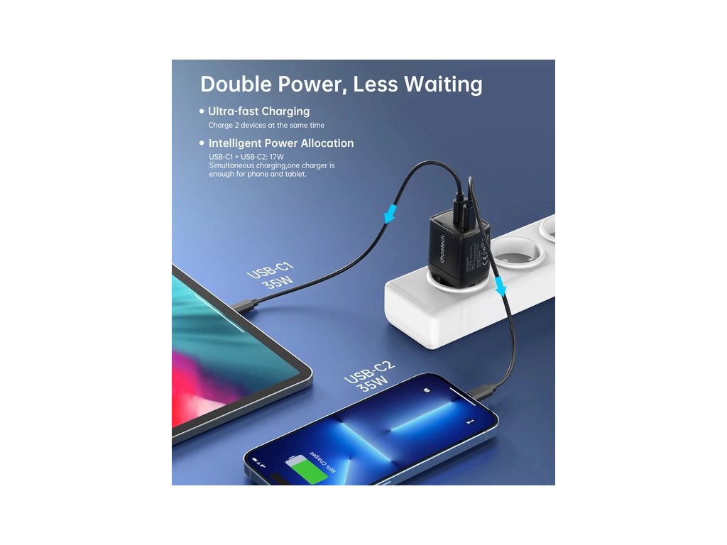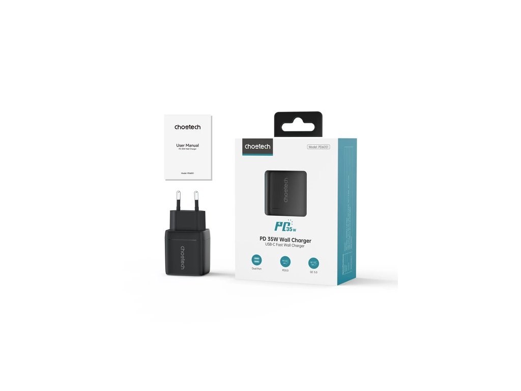 Choetech PD6051 je moderná sieťová nabíjačka vybavená dvomi USB-C výstupmi a technológiou GaN (Gallium Nitride), ktorá zaisťuje efektívne a rýchle nabíjanie s výkonom až 35 W. Je ideálna na každodenné použitie pre smartfóny, tablety, slúchadlá či menšie notebooky.