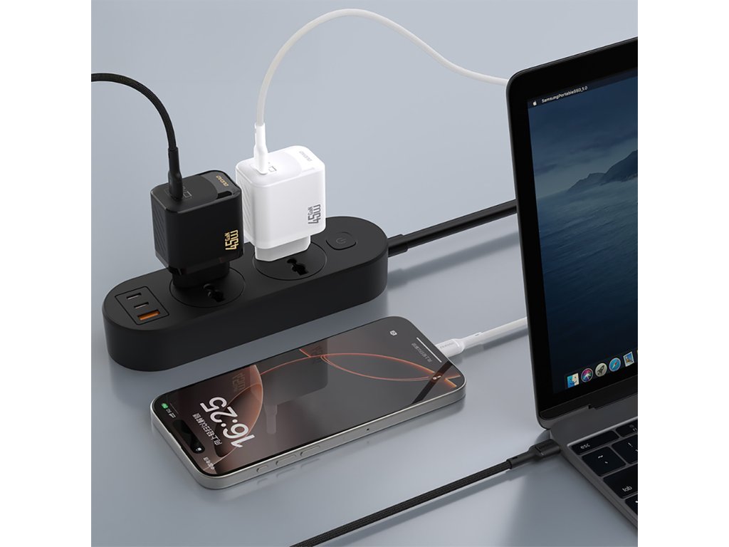 Podpora výkonu až 45W umožňuje rýchle nabíjanie nielen telefónov, ale aj tabletov a notebookov s USB-C konektorom. Nabíjačka sa automaticky prispôsobí pripojenému zariadeniu, aby bolo nabíjanie vždy bezpečné.