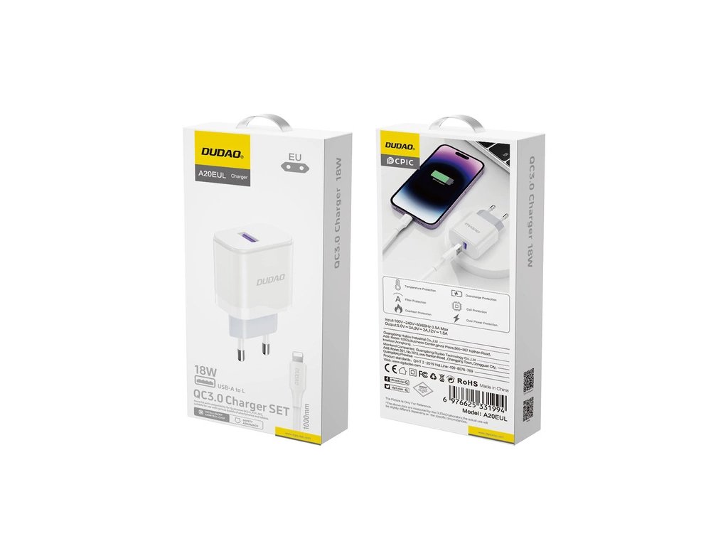 Dudao A20EU je praktická a kompaktná sieťová nabíjačka s USB-A portom a výkonom až 18 W. Balenie obsahuje USB-A / Lightning kábel, vďaka čomu je ideálnym riešením pre používateľov iPhonov, iPadov či AirPods.