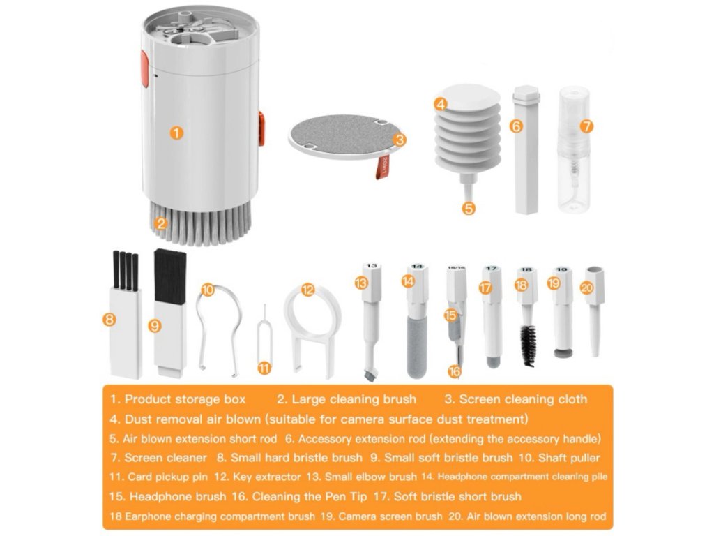 Multifunkčná čistiaca sada 20v1 je ideálnym riešením pre každého, kto chce mať svoje zariadenia vždy v perfektnom stave. Obsahuje až 20 špeciálnych nástrojov, ktoré sú určené na dôkladné čistenie slúchadiel, klávesníc, displejov a ťažko prístupných miest. Všetko je uložené v kompaktnom púzdre, ktoré si môžeš zobrať kamkoľvek so sebou.