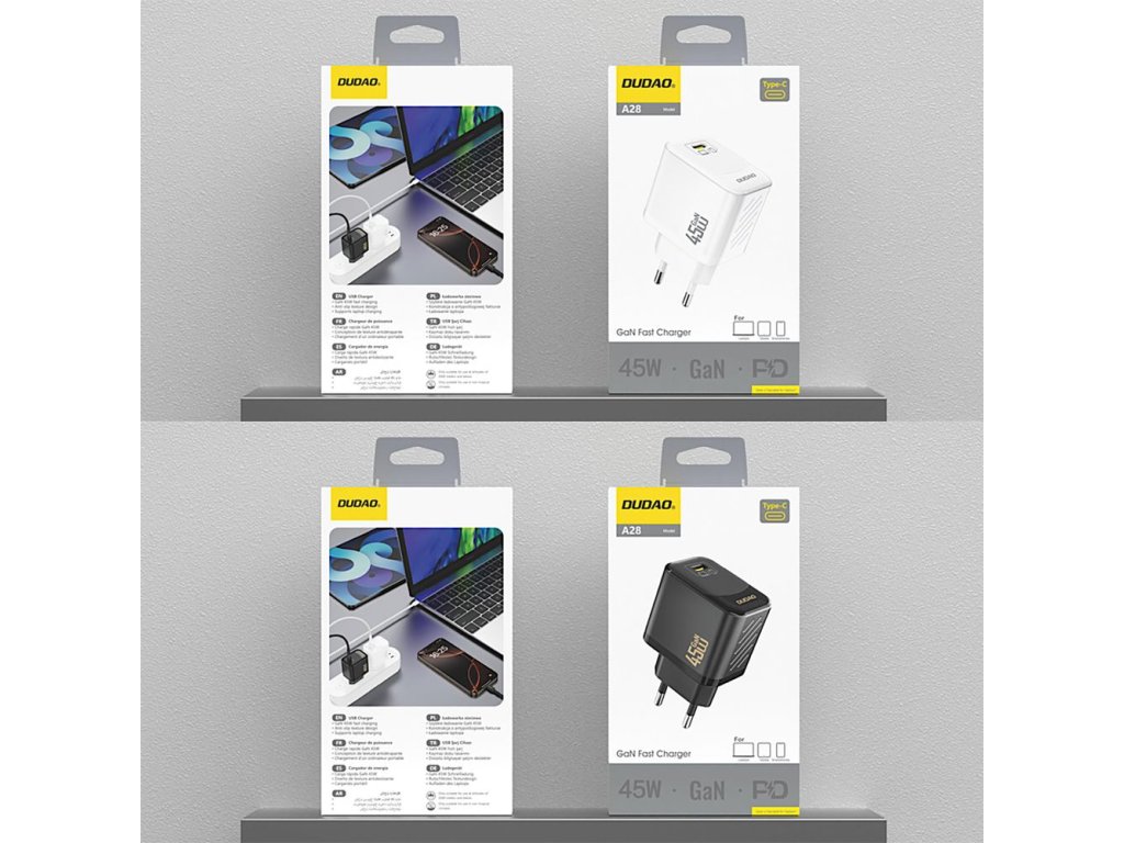 Dudao A28 je moderná nabíjačka s GaN technológiou, ktorá prináša rýchle a úsporné nabíjanie pri výkone až 45W. Kompaktný dizajn, podpora Power Delivery a elegantné biele telo robia z tohto modelu ideálne riešenie pre každodenné používanie doma aj na cestách.