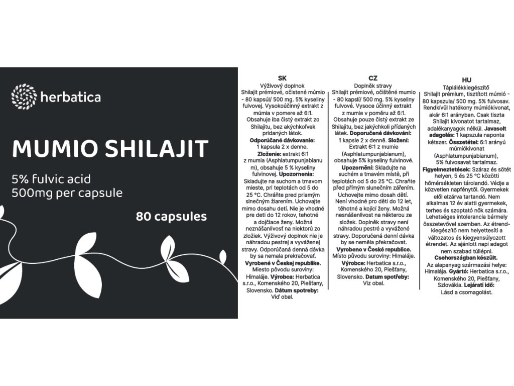 | Zloženie: | Obsah 1 kapsuly: až 500 mg štandardizovaného extraktu 6:1. Extrakt 6:1 z mumia (Asphlatum punjabianum); obsahuje 5 % kyseliny fulvinovej. |