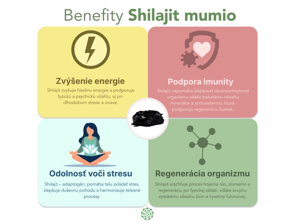 Shilajit (mumio) – bohatý zdroj minerálov (magnézium, fosfor, kremík, železo, zinok, meď, bór, síra), kyseliny fulvovej, humínových kyselín, vitamínov a antioxidantov.