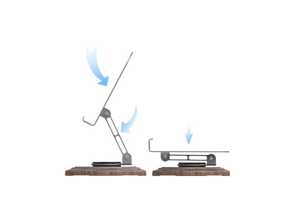 Stojan ponúka plnú otočnosť v rozsahu 360°, takže si môžeš ľahko nastaviť optimálny uhol pohľadu. Vďaka kovovej konštrukcii je pevný a odolný, pričom protišmyková podložka zabraňuje pohybu po stole.