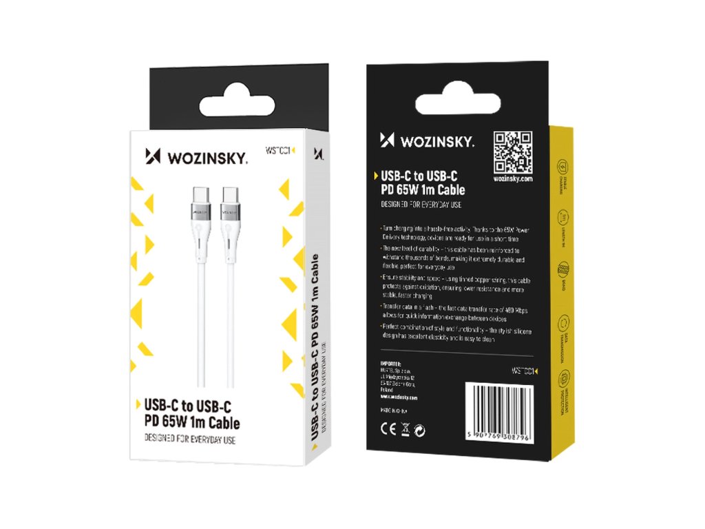 Kábel Wozinsky WSTCC1 s konektormi USB-C / USB-C ponúka spoľahlivé nabíjanie aj prenos dát. Vďaka podpore Power Delivery s výkonom až 65 W je ideálny pre rýchle nabíjanie notebookov, tabletov, smartfónov a ďalších USB-C zariadení.